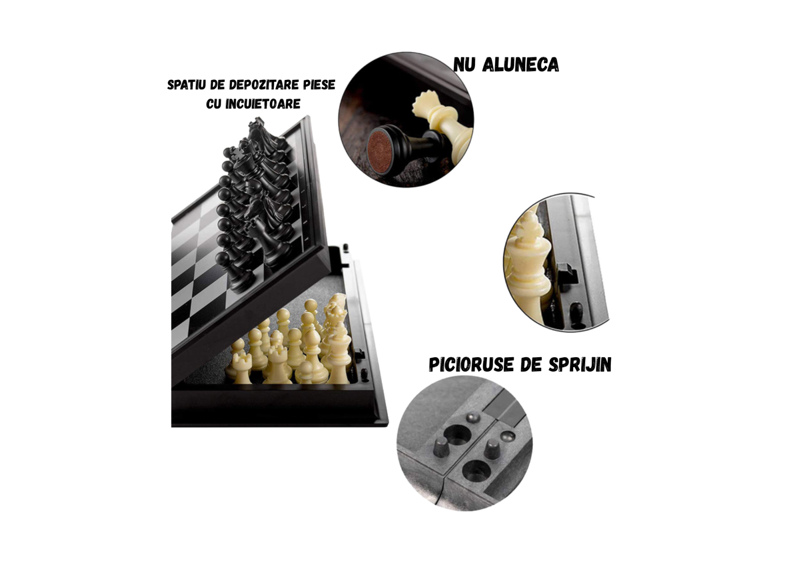 Setul include 62 piese pentru sah, table si dame, plus 5 zaruri. Tabla este pliabila, cu dimensiunea de 32 x 32 x 2 cm si este realizata din ABS cu strat magnetic.