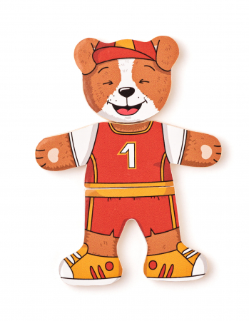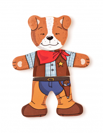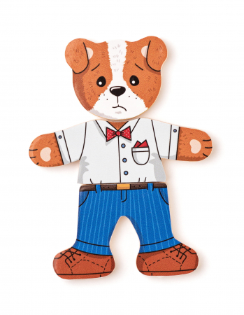 Cutia de lemn este destinata pentru pastrarea puzzle-ului, iar in coperta exista adancituri in forma de catel pentru a putea lucra mai usor. Haine, pantofi, fete pot fi combinate pentru a avea de fiecare data o jucarie noua. Copilul va invata sa gaseasca piese lipsa si va invata conceptul de "parte" si "intreg". Contine: 18 piese. Dimensiuni: 13 x 14 x 4 cm.