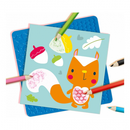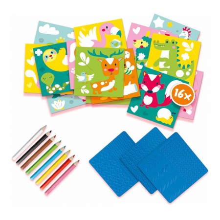 Acest set de arta Rub contine 16 foi de colorat care pot fi colorate cu ajutorul unor modele distractive in relief. Asezati o foaie de colorat pe una dintre cele trei foi de frecat si frecati peste ea cu un creion de colorat. Ce modele vedeti? Foile de frecat sunt reutilizabile. Contine: 16 foi de colorat; 3 foi de plastic de frecat; 8 creioane colorate.