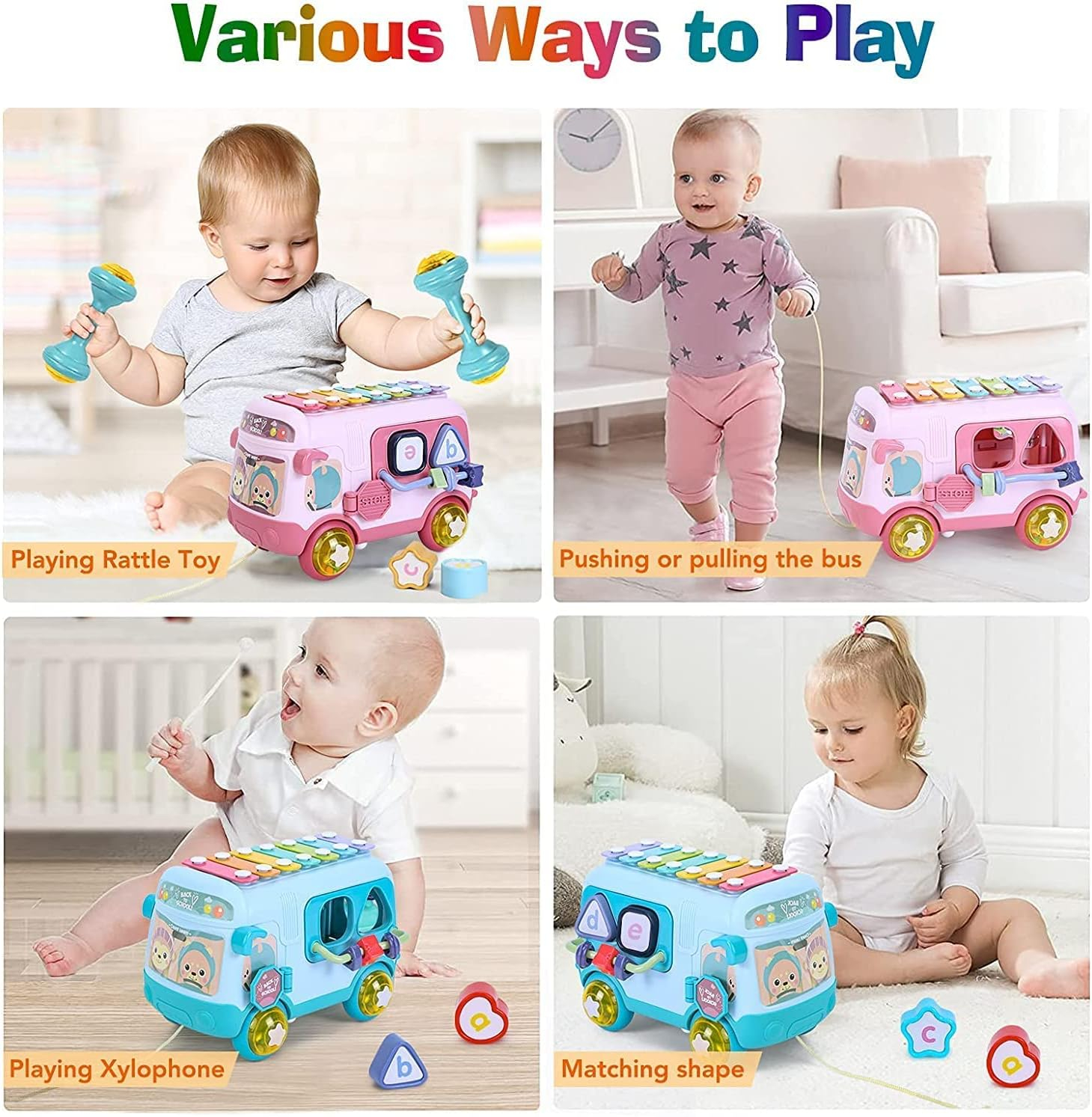Copiii pot trage autobuzul dupa ei, pot potrivi formele colorate, pot canta la xilofon sau se pot juca cu rotile detasabile, transformand fiecare moment de joaca intr-o ocazie de invatare prin miscare si sunet.