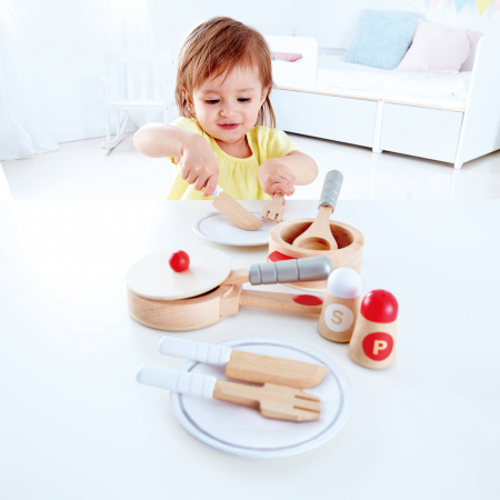 Acest set de mancare de joaca include oala, tigaie, capac, lingura, spatula, doua farfurii, doua seturi de cutite si furculite si o pereche de sare si piper.