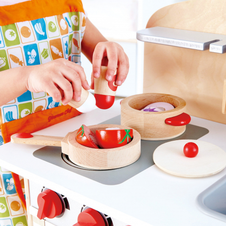 Setul este un supliment excelent pentru seturile de gatit, mai ales atunci cand este asociat cu seturile de bucatarie si mancare Hape. Acest set distractiv de gatit ii va incuraja pe copii sa imparta cu prietenii sau familia!