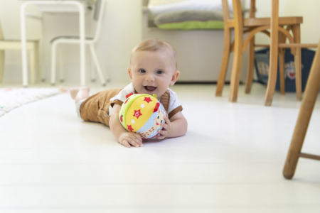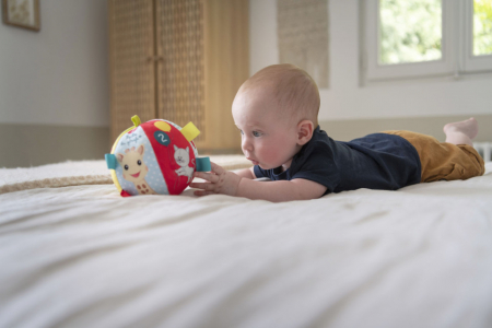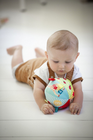 O minge jucăușă , 100% textilă, pentru a stimula dezvoltarea simturilor copilului!