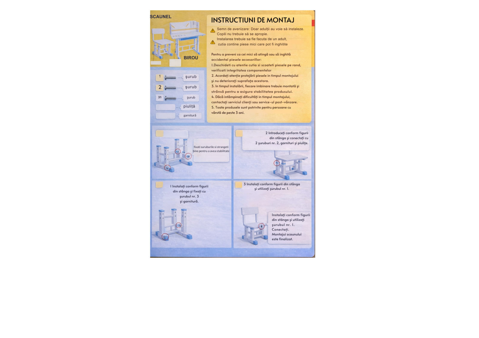 Accesorii Incluse: Biroul este echipat cu un abac educativ, un suport pentru creioane, un sertar pentru depozitare si ceas, ajutând la menținerea organizată a spațiului de lucru.